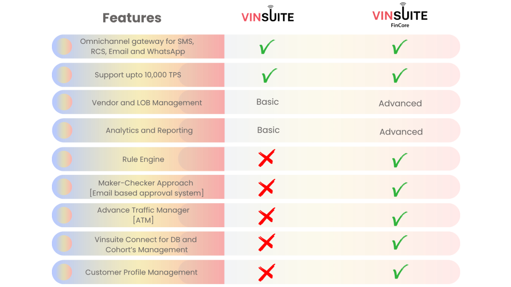 Vinsuite and Vinsuite Fincore empower your business with secure, scalable, and real-time messaging—ensuring seamless communication, high deliverability, and better customer engagement across every channel.